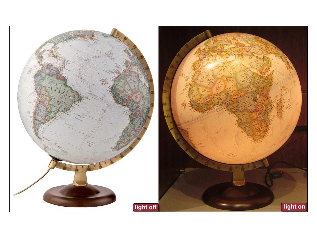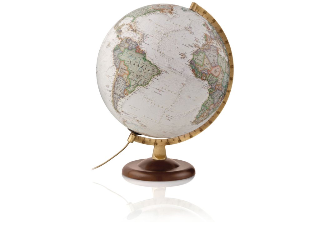 Dekorativní globus ve stylu antik a v designu National Geographic - oceány v barvě slonovinové kosti. Celkově působí velice elegantně a decentně. Podstavec je dřevěný z leštěného ořechu a poledník je mosazný. Globus se skvěle hodí především jako bytový doplněk k tmavému i světlému nábytku a jako decentní přisvícení místnosti. Popis v anglickém jazyce. K výrobku je přiložen návod na výměnu žárovky. Náhradní žárovka není součástí balení a je běžně dostupná v obchodní síti.