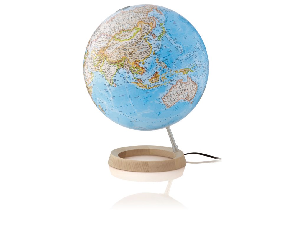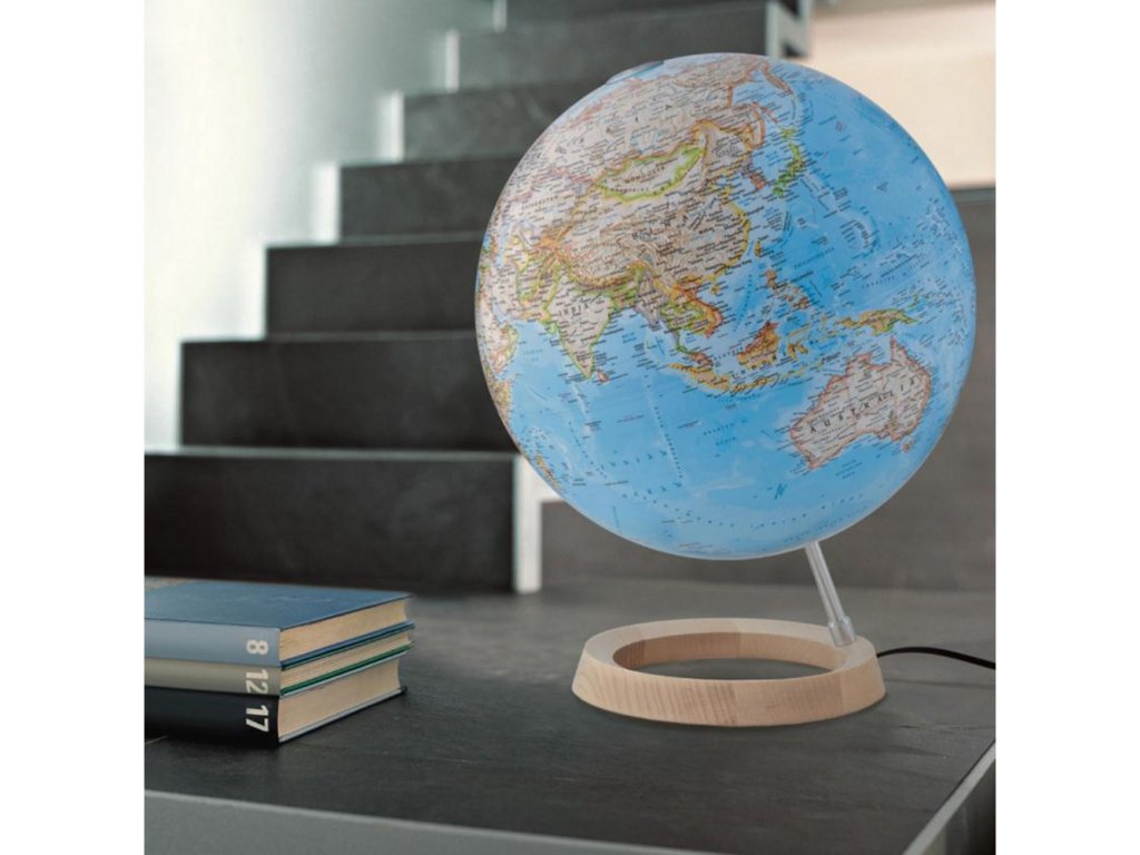 Zeměpisný globus ve stylu "modrý oceán" a designu National Geographic - barvy jednotlivých států jsou decentní, s výraznějšími hranicemi. Podstavec je dřevěný odlehčený-tvar mezikruží, zemská osa kovová. Globus se skvěle hodí především jako bytový doplněk k světlému nábytku a jako elegantní přisvícení místnosti. Zajímavostí je, že po jeho rozsvícení se na jinak ryze zeměpisné mapě zobrazí politické dělení světa. Popis v českém jazyce. K výrobku je přiložen návod na výměnu žárovky. Náhradní žárovka není součástí balení a je běžně dostupná v obchodní síti.