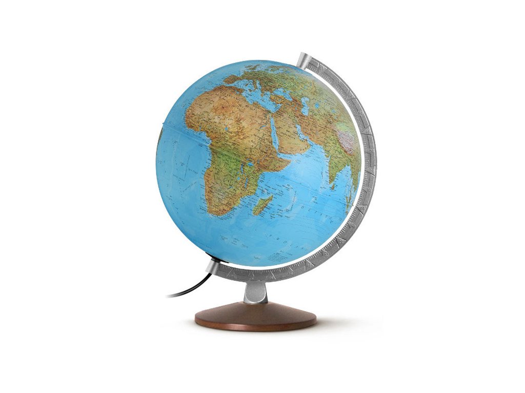 Zeměpisný globus ve stylu modrý oceán. Podstavec je dřevěnný, rameno kovové. Popis v českém jazyce. Po rozsvícení se zvýrazní barevné politické rozlišení států.Baleno v ochranné, odnosné krabici.