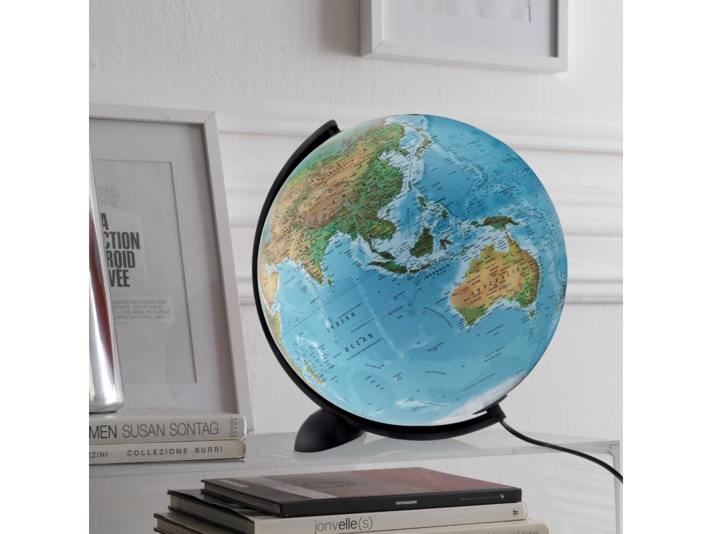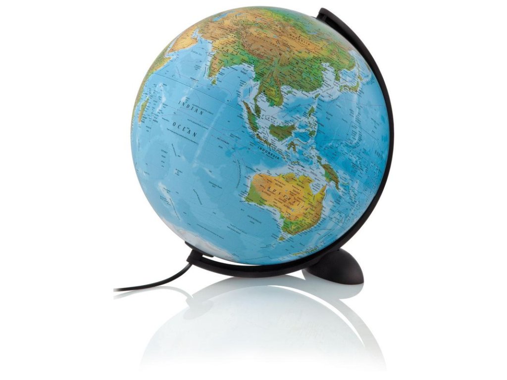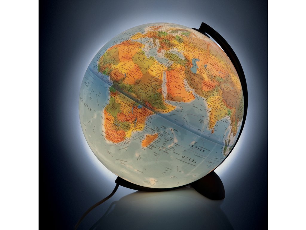Zeměpisný globus ve stylu "modrý oceán". Netradičně řešený podstavec je z matné, měkčené pryže stejně jako poledník. Neobvyklá konstrukce zajištuje perfektní stabilitu a předurčuje tak výrobek na pracovní stůl žáka či studenta i jako decentní přisvícení dětského pokoje. Zajímavostí je, že po jeho rozsvícení se na jinak ryze zeměpisné mapě zobrazí politické dělení světa. Popis v anglickém jazyce. K výrobku je přiložen návod na výměnu žárovky. Náhradní žárovka není součástí balení a je běžně dostupná v obchodní síti.