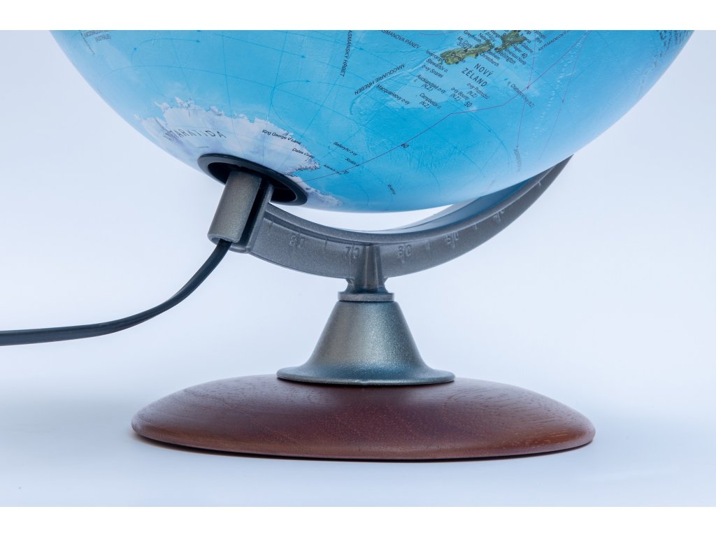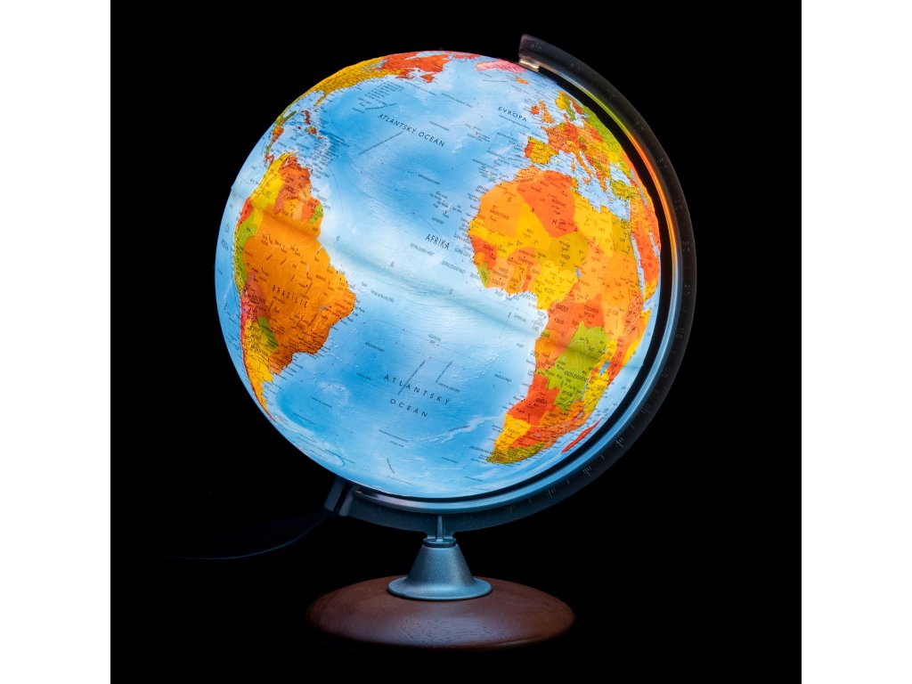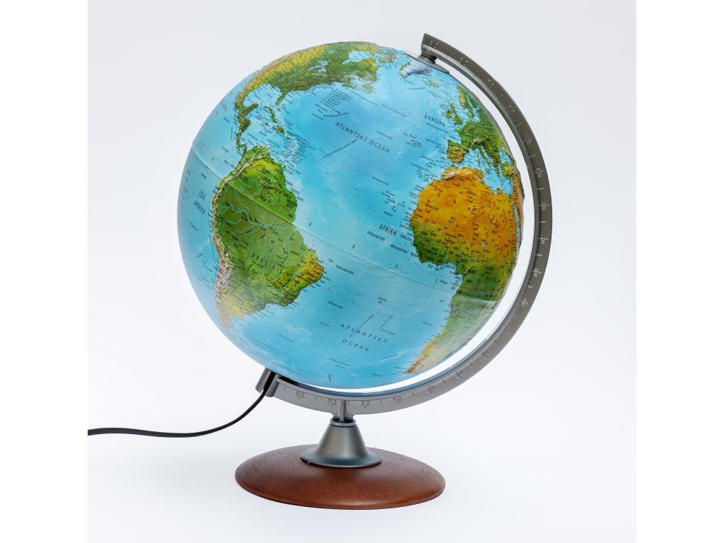 Kromě barevné hypsometrie je výškopis zvýrazněn plastičností a to celkem výrazně. Popis v českém jazyce, po rozsvícení se zvýrazní barevné politické rozlišení států. Podstavec je dřevěný, rameno plastové.
